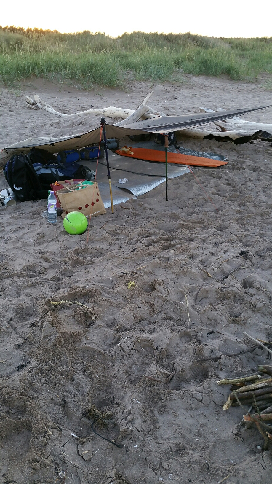 The tarp was secured on two sides with the 2 washed up trees then survival techniques kicked in sticks were buried a couple of feet in the sand, securing walking poles giving the shelter height. The tarp was big enough for four sleeping mats