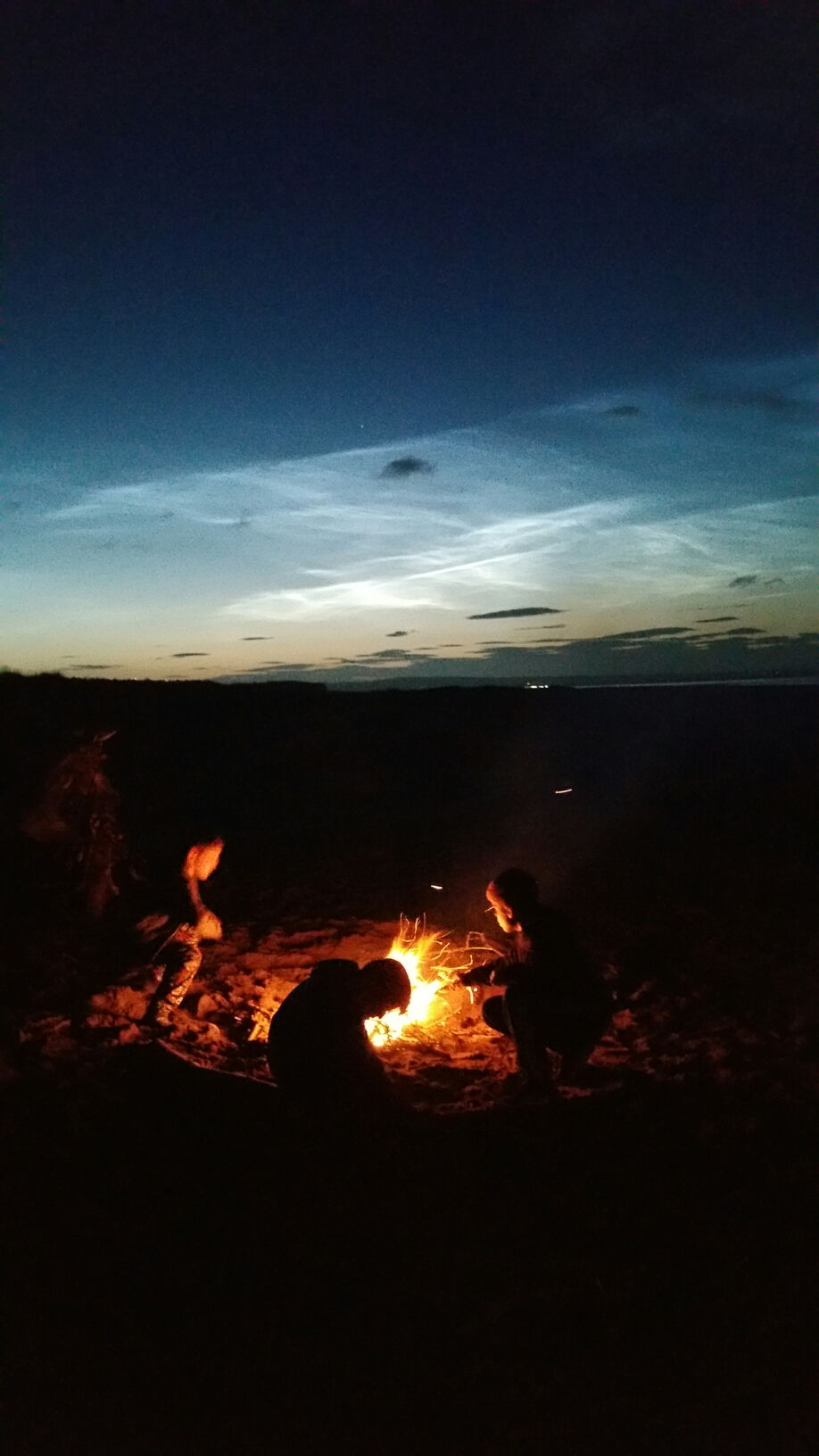 We got the fire started. That was when I noticed the sand shrimps about 5mm in length bouncing about in the sand. When I mentioned this to the boys they did not seem to concerned. The sausages were cooked and consumed, the boys became transfixed with poking sticks in the fire. That was when I noticed the noculenti sky. When the sun below the horizon shines on the high altitude clouds highlighting them