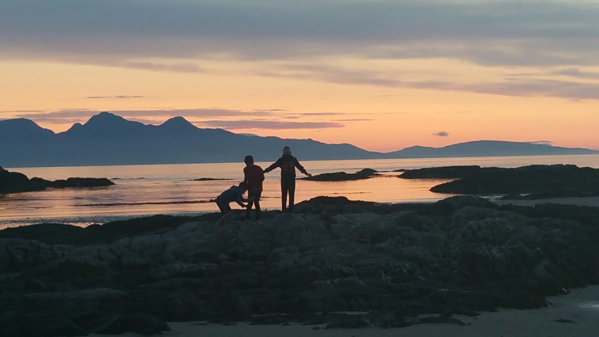I don’t know if it was the relaxing effects of the swim, submerged in the picturesque loch surrounded by the green hills, or the opportunity spend time together laughing, concentrating on ourselves. Perhaps it was the full focus on controlling our bodies, emotions and feelings, we were both out of our comfort zones, I was appearing to look calm swimming in only trunks trying not to be worried hoping Clare was enjoying herself, Clare’s comfort zone was being stretched in all directions in the middle of a Loch for the first time. Trying not to panic when she could not feel or see the bottom, then trying to stay tranquil when the loch bottom transformed into knee deep, soft viscous mud. For a short time we were not discussing children, finance’s or jobs lists, we were caught in the moment. It doesn’t happen very often, if we get a night off, or go for a meal or a walk together we end up talking, resolving home, family, work issues or end up creating more by considering the future. These discussions are hard by text, emails or intermittent satellite phone calls offshore. I focus, relax, and clear my mind type thing during running, swimming or mountain biking, Clare practices Pilates, these are solo activities we might get the odd day snowboarding together but they are like hens teeth. Drifting round the island was magical only focused on us, on that point in the present. Her smile was massive in between the big breadths of calming air.