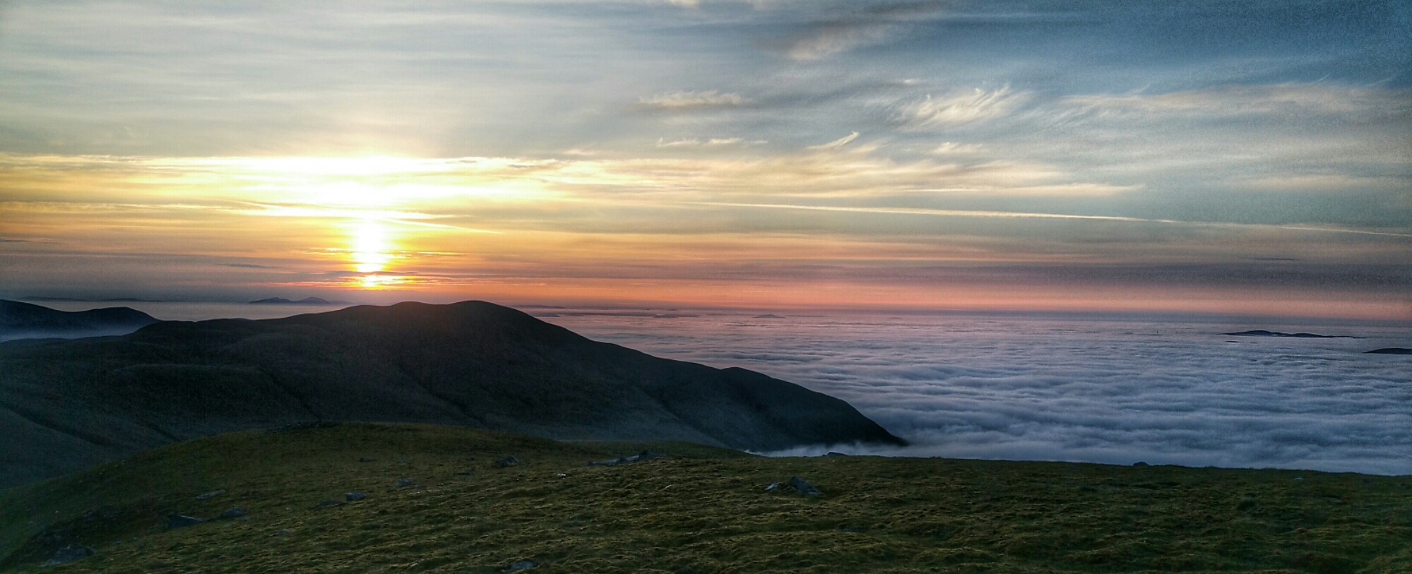 We set off on the imaginary safe route the first ten steps squelching into the boggy Heather we knew this would be hard work, after 5 minutes my legs were burning. There nothing else for it the dig in and keep climbing. By this point it was easier to carry the full suspension bike on my back than try to push hold brakes step up the steep slope. We were gaining height but slowly. Stopping for a breather we could see we were just above the low lying clouds. The clouds started to enter the corrie bowl covering my swimming spot they were increasing speed filling the small Glen with big white fluffy cloud at a furious rate we watched it engulf the area below with a pinking sky to the east as the sun started disappearing.