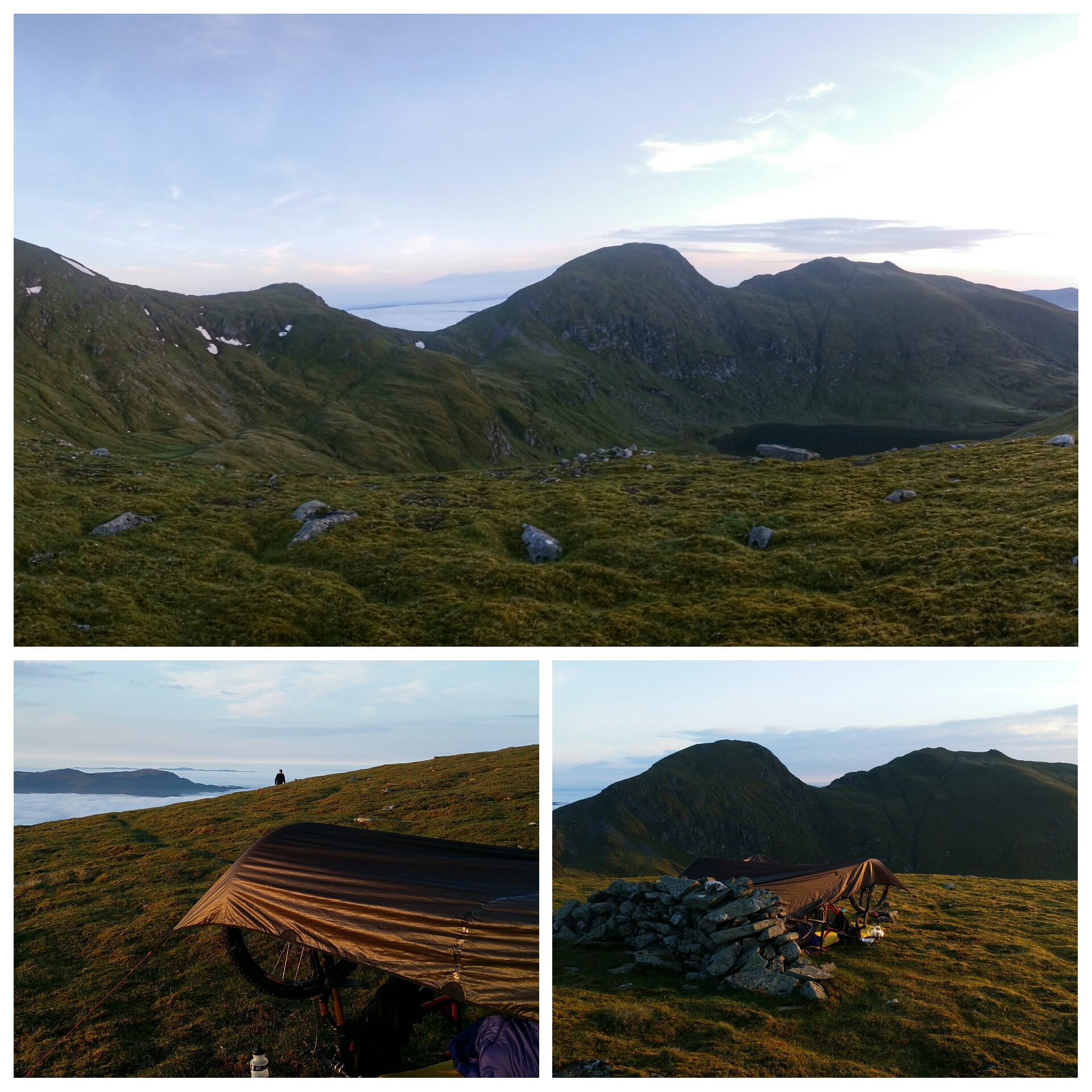 With the bike back on my back the mammoth task continued I had earphones on and the continual beats helped. I also repeated – this is easy over and over over again. Something I had learned a few years ago walking with a friend. We were both tired struggling up Ben Macdui in the Cairngorms when he accelerated away in front. After reaching the summit I asked him where he got the extra energy from. He mentioned that he realised this might be the last time he got the chance to walk up a hill, instead of reflecting on the aches an pains and lack of energy, immerse yourself in the joys. Dont waste opportunities grab them with both hands. This is easy. We reached the shoulder and a flat area just as the sun disappeared, a light drizzle had kept us cool on the climb, now it was going to make us cold. The first job was to make a shelter. We found a 6 foot( in length not height) dry stone wall (we did not care at the time why anybody would bother to make only 6 feet or why they left 6 feet of stone wall.) we used up turned bikes as poles for the tarps and set up camp we were facing the south east as the stove heated up the chamomile tea the rain had ceased it was brilliant camp but with the niggling doubt, we still had to reach the summit up the mythical east ridge. It didn’t stop us giggling past midnight about Falconhoof sketches from the lemmy show