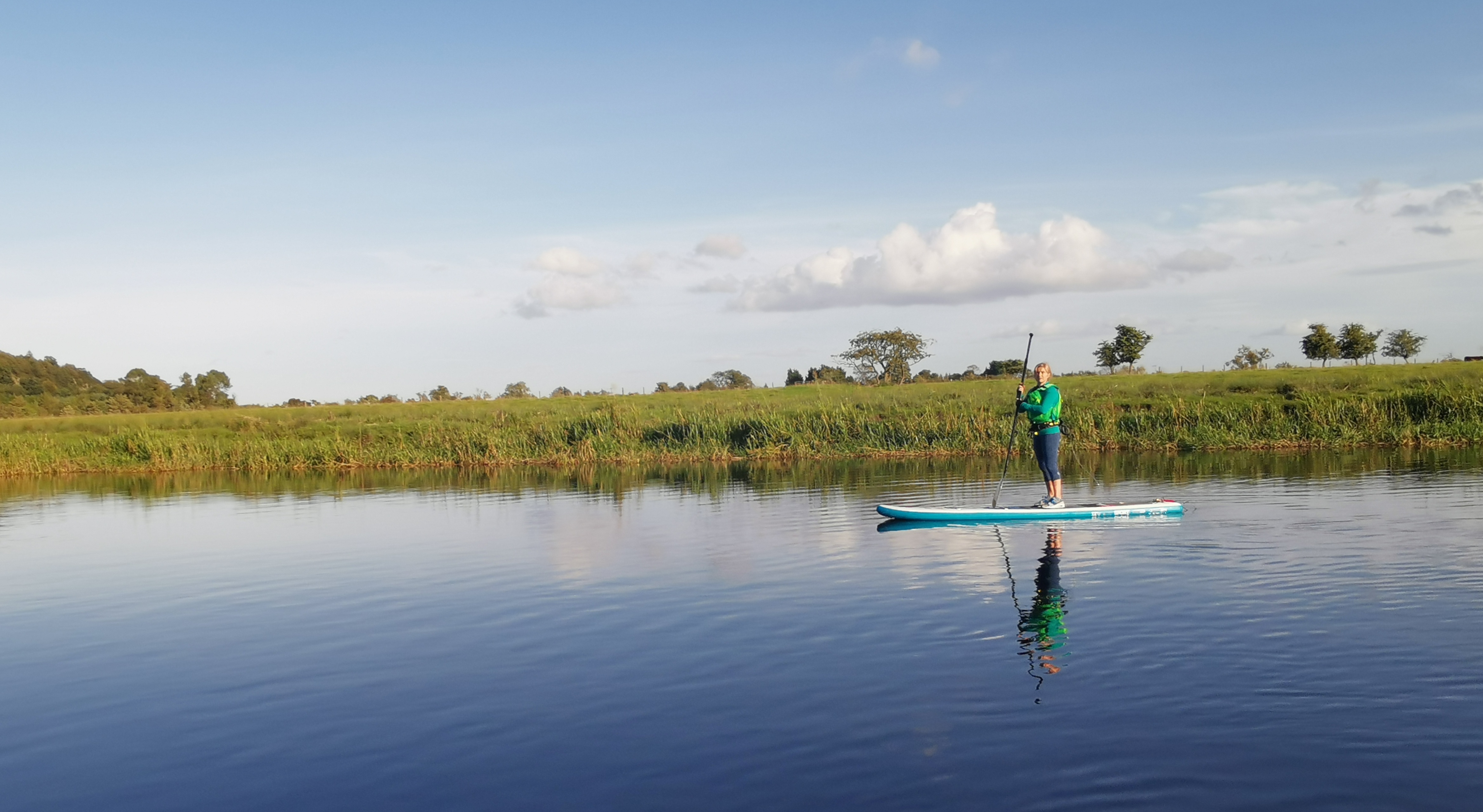 There is something calming for my soul watching Clare on her board,gentle paddling with a westerly breeze on our back’s pushing us down stream. The River is fenced off in between two busy housing estates and the water becomes our a secret garden. We embrace the seclusion. Only us, ducks, swans, big pterodactyl like cranes, the odd fish jumping and rare a seal. You get a rower now and then, they race away before the serenity disappears.